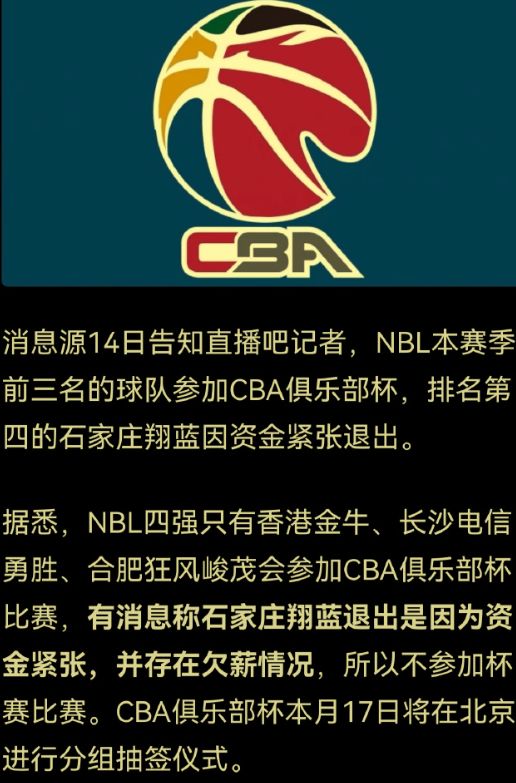 不过有消息称,石家庄翔蓝男篮还存在欠薪情况,那确实没啥心情参加俱乐杯。因为他们首先要想办法解决眼前的现实问题,如果欠薪得不到及时处理,就算球队想参加俱乐部杯,但是球员愿意吗?