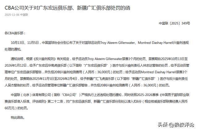 通知说明,根据《反兴奋剂规则》有关规定,给予运动员Troy Akeem Gillenwater禁赛3个月的处罚、禁赛期自2025年10月13日至2026年1月12日,给予广东宏远华南虎俱乐部(以下简称“广东宏远俱乐部”)医疗与反兴奋剂责任人林志达警告的处罚,给予运动员管理单位广东宏远俱乐部警告,并负担20例兴奋剂检测费用(人民币:36,000元)的处罚;给予运动员Montrezl Dashay Harrell禁赛3个月的处罚、禁赛期自2025年11月5日至2026年2月4日,给予新疆广汇飞虎俱乐部(以下简称“新疆广汇俱乐部”)医疗与反兴奋剂责任人吴杰警告的处罚,给予运动员管理单位新疆广汇俱乐部警告,并负担20例兴奋剂检测费用(人民币:36,000元)的处罚。