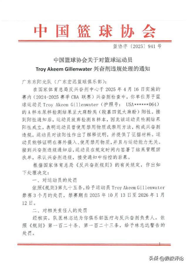 值得一提的是此前广东大外援吉伦沃特的情况也比较类似,吉伦沃特遭到禁赛三个月,广东东阳光队(广东宏远篮球俱乐部)作为管理单位受到了警告及负担20例兴奋剂检测费用(人民币36000元)的处罚,该单位的医疗与反兴奋剂负责人、队医林志达被给予警告处罚。