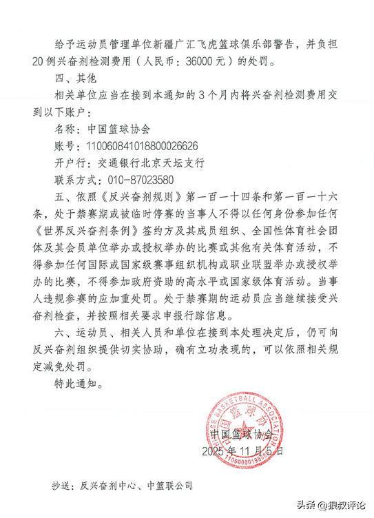北京时间11月6日,根据中国篮协官方社媒公示,对于上个赛季新疆外援哈雷尔事件开出罚单,禁赛3个月,以及新疆俱乐部承担36000元的检测费用。