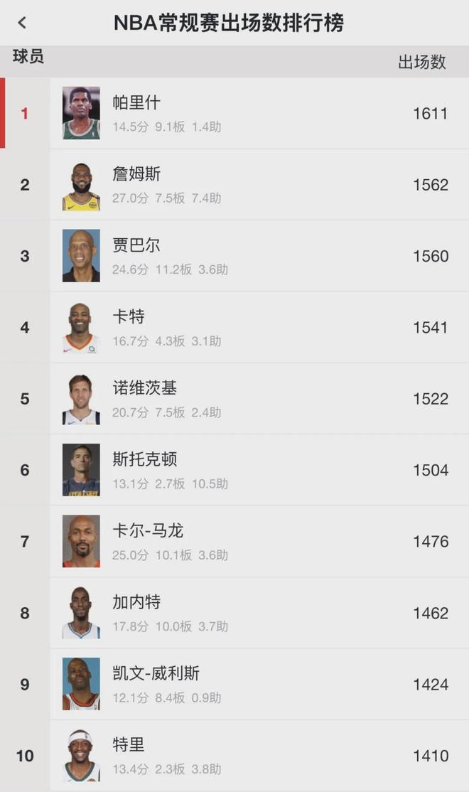截至目前,詹姆斯已经打了1562场常规赛,距离罗伯特-帕里什的历史纪录(1611场)仅差49场。常规赛总出场时间、总得分、总出手、总失误和打铁数,均是历史第一。运动战进球数和罚球命中数,均是常规赛历史第二。