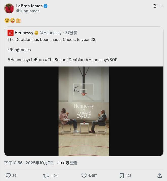 北京时间10月7日晚11点左右,詹姆斯提前一个小时公布自己的决定,他没有宣布退役,也跟亚马逊无关,而是发了另一个广告。詹姆斯穿上当年加盟热火的衬衫,他在视频中表示,自己决定将天赋带给轩尼诗(著名白兰地品牌)。