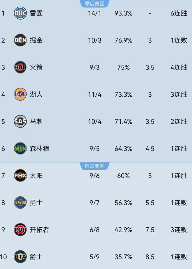 话说斯普利特估计转正没戏了,近六场比赛输了5场,唯一一场胜利赢的是西部垫底的鹈鹕,目前以6胜8负排名西部第九,好在仍牢牢处于附加赛区域,西部第十的快船(4胜10负)距离他们还有两个胜场。