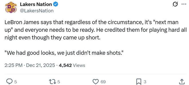 赛后詹姆斯也提及这一问题,直言:“无论发生什么情况,所有人都要有下一个顶上的心态,每个人随时都要做好准备,尽管没能取胜,但队友们足够努力,只是没能命中那些机会不错的投篮而已。”