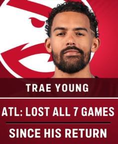 根据统计,自特雷-杨12月19日伤愈复出以来,这位4届全明星后卫代表老鹰出战了5场比赛,场均砍下20.8分10助攻,但在此期间老鹰遭遇了7连败。
