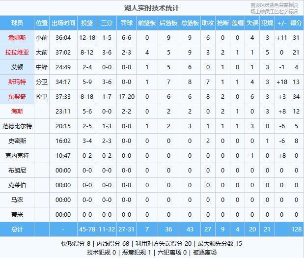 湖人:东契奇34分6板8助2断、詹姆斯31分9板6助、拉拉维亚21分9板3助2断、斯玛特13分8板7助、海斯12分2板2断、史密斯8分2助、范德比尔特5分3板1助、艾顿4分6板