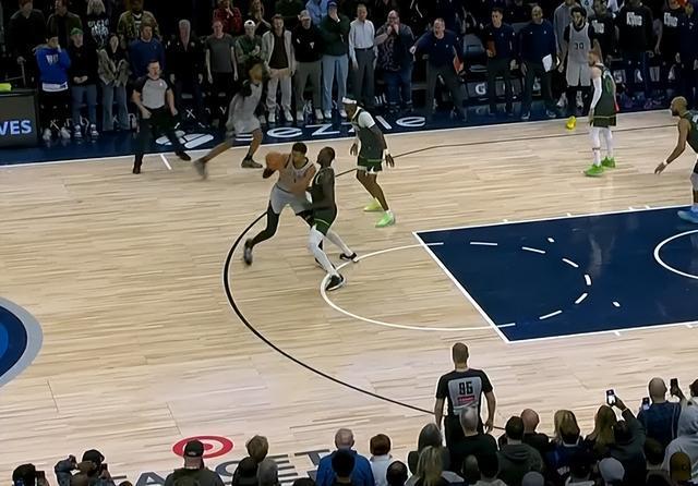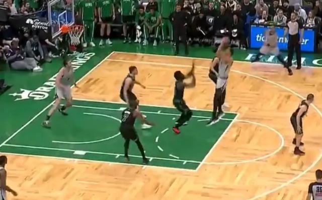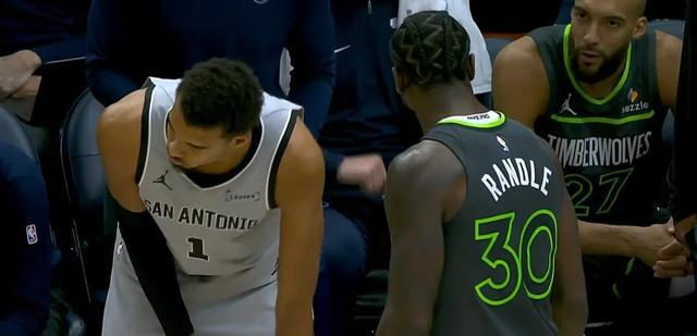 还有一个回合,文班被兰德尔逼到了边线,最终直接倒在场外,裁判没有吹犯规而是吹了马刺出界。