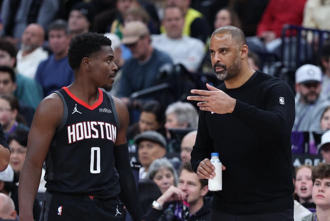 当乌度卡不用霍勒迪和谢泼德,球队又完全没有组织和空间点,促使进攻端非常便秘,但是这两人在场,在场的效果又非常糟糕,疯狂丢后场篮板,于是乌度卡被迫使用双塔阵容,让亚当斯+申京同时在场,当亚当斯+申京+阿门这三人同时在场,火箭的空间难受承担,进攻开发便秘程度,无以复加,又让乌度卡受不了。