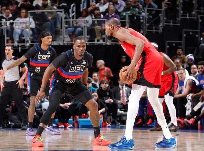 反观活塞这边,他们的核心后卫康宁汉姆今天伤愈复出,CC状态虽未完全恢复,但至少给球队注入了主心骨的力量。在人员对比如此悬殊的情况下,火箭能够取胜,很大程度上要归功于37岁的杜兰特。他完全不像一个步入生涯暮年的老将,背靠背作战的疲劳仿佛对他无效,依然打出了统治级的表现。整场比赛的战术基调非常清晰:双方都把防守重心放在内线,采用高强度的协防和轮转,不给对手任何轻松冲击篮筐的机会。结果就是两队在内线都打得异常“铁血”篮下终结效率低下,外线投篮同样手感冰冷。火箭除了杜兰特几乎全队哑火,活塞同样是“怎么投怎么不进”的尴尬局面。