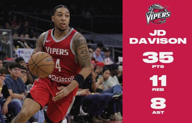 本场比赛中,虽然毒蛇输掉了比赛,但是被火箭下放到NBA发展联盟赛场进行锻炼的双向合同后场球员JD-戴维森(JD Davison)的表现算得上是令人刮目相看。戴维森全场出场38分钟,投篮24中13,三分线外5中1,罚球6中5,拿下了全场最高分35分11篮板8助攻3抢断3盖帽的准三双数据,还有1次失误和5次犯规,正负值为-2。戴维森在进攻端大杀四方,展现出了全面的得分能力,他的突破和终结能力非常出色,他也具备一定的投射能力,他的得分能力真是相当惊人。不仅如此,戴维森在防守端都有着相当不错的表现,同样是起到了决定性的作用的。戴维森在本场比赛中的表现绝对算得上是攻守兼备的水平,只是球队的整体表现不如对手,不少球员的状态一塌糊涂,戴维森的努力也没有办法帮助球队扭转局面。