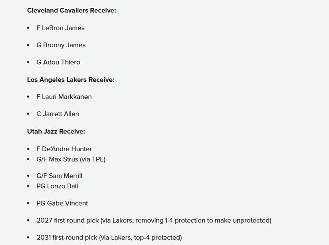 爵士得到:亨特、斯特鲁斯、梅里尔、朗佐-鲍尔、文森特、湖人2027年首轮签(移除前四顺位保护,变为无保护签)、湖人2031年首轮签(前四顺位保护)