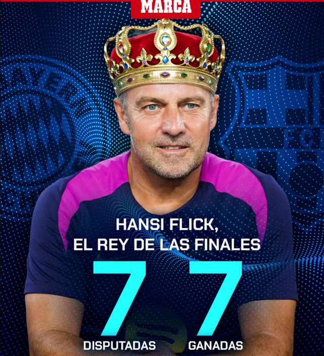 《马卡报》表示,在决赛舞台上,弗里克执教的球队,总有稳定发挥,最终夺得冠军。这样的故事,已经发生了7次: