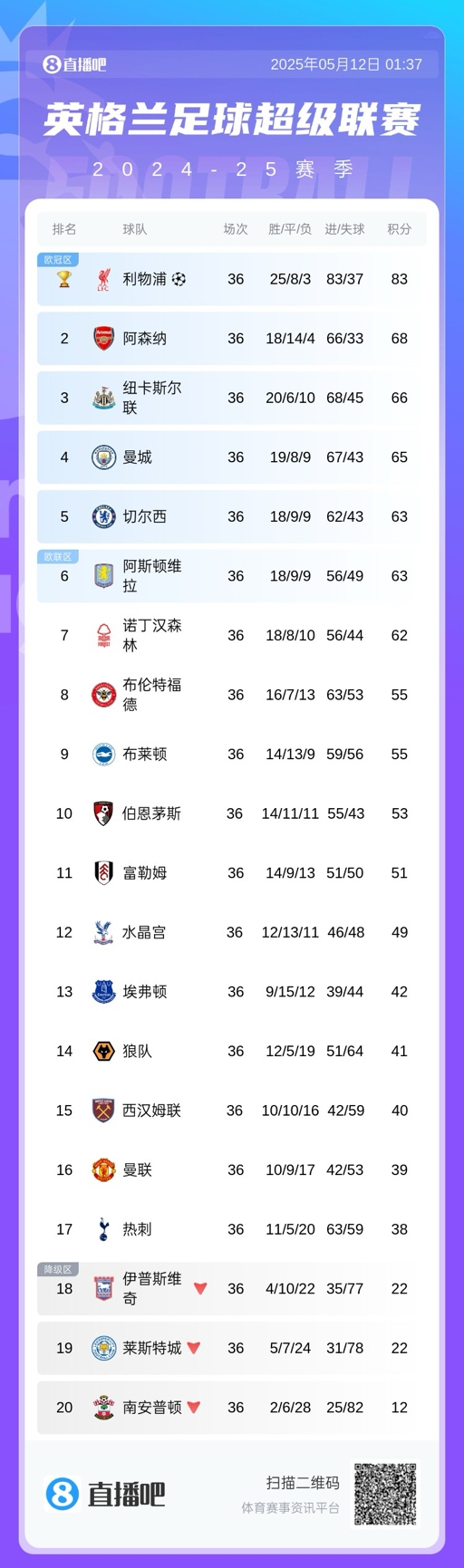 英超积分榜:阿森纳领先第五5分,差1分锁定欧冠资格