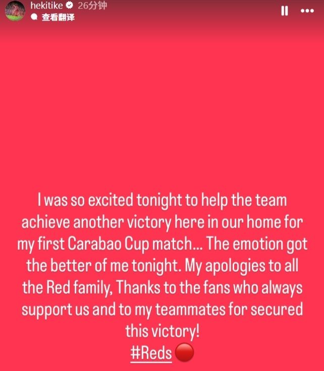 赛后,埃基蒂克在社媒向利物浦球迷道歉:“今晚能首次参加联赛杯主场赛事并帮助球队再夺胜利,我无比激动!但今夜情绪确实有些失控。在此向所有红军大家庭致歉,也感谢一直支持我们的球迷,以及携手赢下比赛的队友们!”