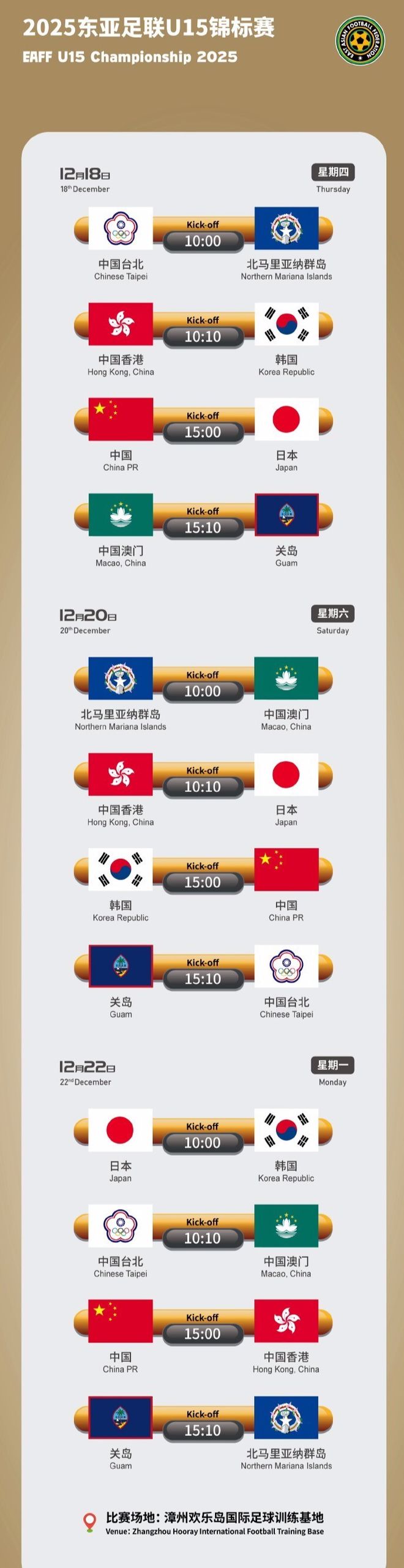 比赛两天一场,中国U15男足将在18日首战日本,20日次战韩国,最后在22日踢中国香港。每场比赛时长为70分钟,分为上下两个半场,每半场各35分钟。