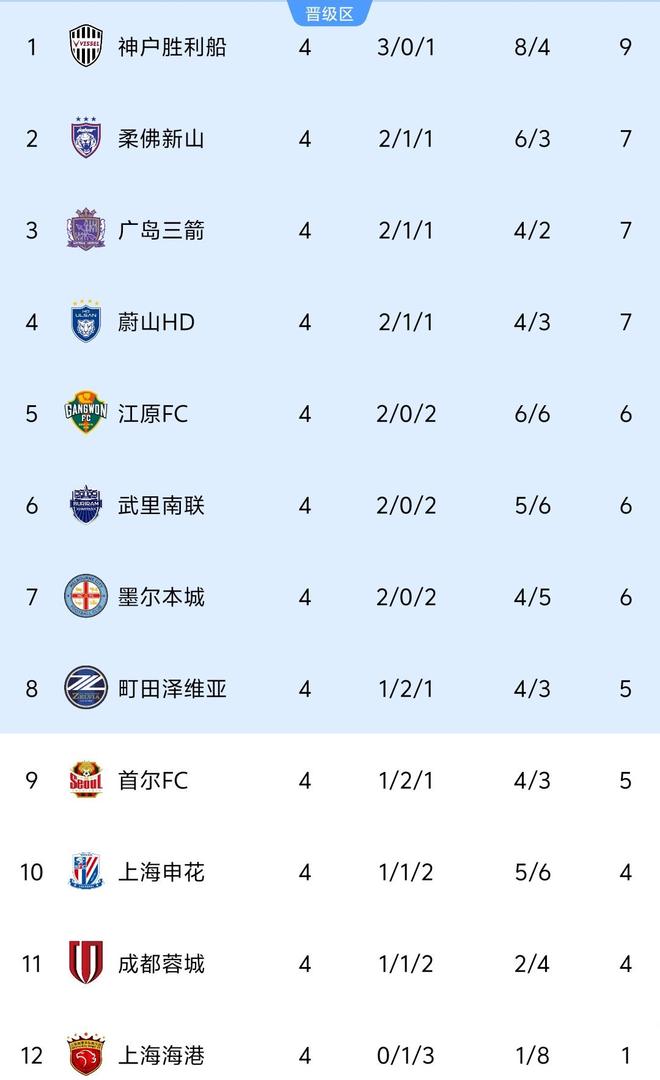 4轮过后的积分榜,由于本轮惨淡的战绩,3支中超球队不仅全都无缘前8,而且包揽了倒数3名的位置。申花和成都蓉城同积4分,申花凭借着净胜球的优势排在倒数第3,成都蓉城位列倒数第2,唯一没有取胜的上海海港积1分垫底。榜首方面,神户胜利船成为唯一一支4轮3胜的球队,以9分领跑积分榜,广岛三箭、蔚山HD同积7分分列第2和第3。